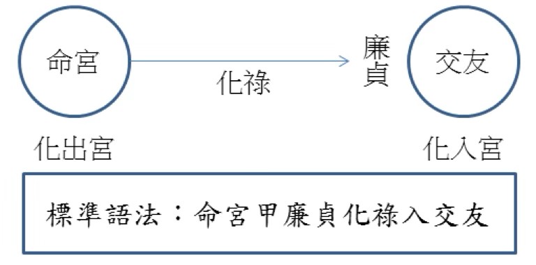 命宮甲廉貞化祿入交友宮,命宮的天干為甲,交友宮的座星為廉貞星,命宮為內在思維,起心動念時,由天干發送「甲氣」的訊號而出,我們稱命宮為「化出宮」,與交友宮的座星廉貞星產生感應,廉貞星是訊號接收器,收到此訊號所代表的意象為「化祿象」,產生化祿象後進入交友宮,此訊號便「坐」在交友宮,交友宮我們稱為「化入宮」,於是就產生了命宮與交友宮的互動連結。